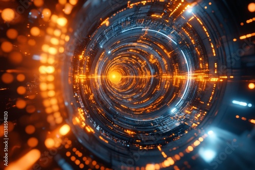 Abstract digital tunnel with glowing orange and blue lights in a futuristic setting
