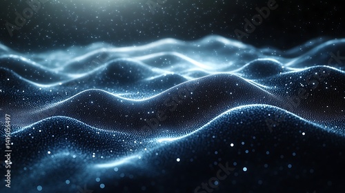 Abstract Digital Waves with Sparkling Particles, Abstract digital waves in blue with sparkling particles, resembling a cosmic or oceanic scene