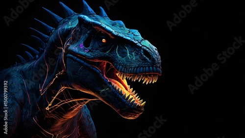Abstract dinosaur head emerging from pitch black darkness, surreal lighting, neon outlines, glowing cracks on the skin, background fading into shadows,Generative Ai