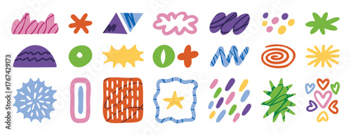 Abstract doodle elements with spirals, plants and wavy lines in naive style. Hand drawn.