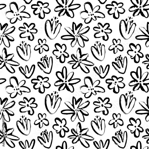 Abstract doodle pattern with floral motif. Herbal and daisy ink illustration. Vector doodle seamless pattern. Dry brush style floral motives. Black paint illustration with chamomiles and wild plants