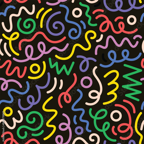 Abstract doodle seamless pattern. Creative squiggle color lines. Trendy colorful background.