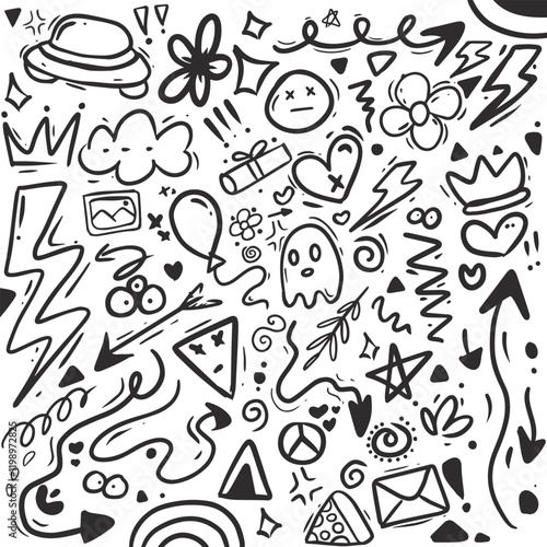 Abstract doodles, Hand drawn pointing arrow, outline shapes and doodle frames. Ink signs, line curved arrow, heart and circle sketch isolated vector illustration symbols set