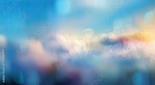 Abstract dreamy sky with clouds, blue, pink, and yellow hues, bokeh effect