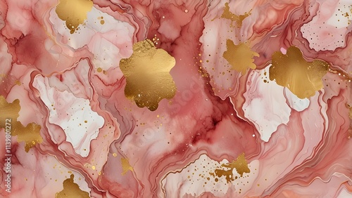 Abstract dusty blush liquid watercolor background with golden crackers. Pastel pink marble alcohol ink drawing effect. Generative AI