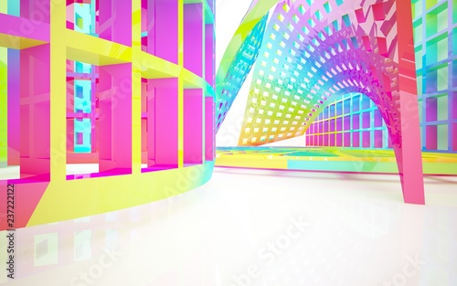 Abstract dynamic interior with gradient colored objects. 3D illustration and rendering