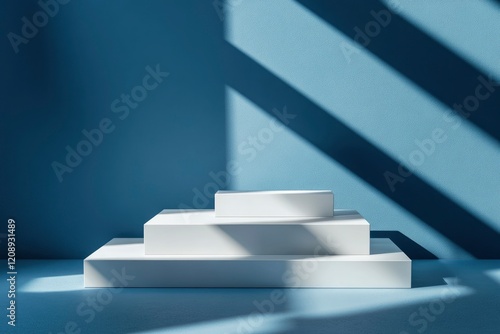 Abstract empty white podium with geometric shadows on blue background. Mock up stand for product presentation. 3D Render. Minimal concept. Advertising template.
