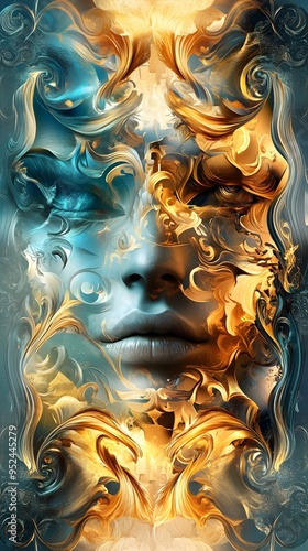 Abstract Face with Golden and Blue Swirls.
