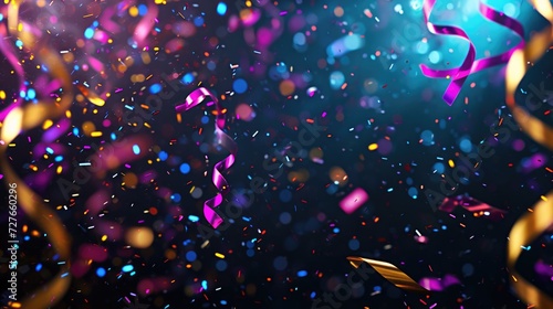 Abstract festive background with glitter, confetti, ribbons and free place for text. New Year, Christmas, birthday, holiday celebration banner