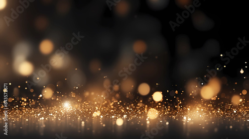 Abstract festive dark background with gold glitter and bokeh. New year, birthday, holidays celebration.