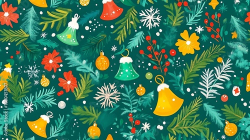 Abstract Festive Green Pattern with Bells, Snowflakes, and Flowers