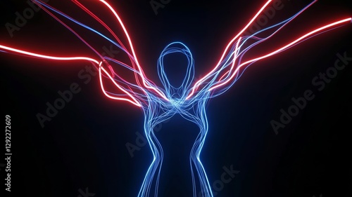 Abstract figure outlined with glowing blue lines, red energy radiating from shoulders.