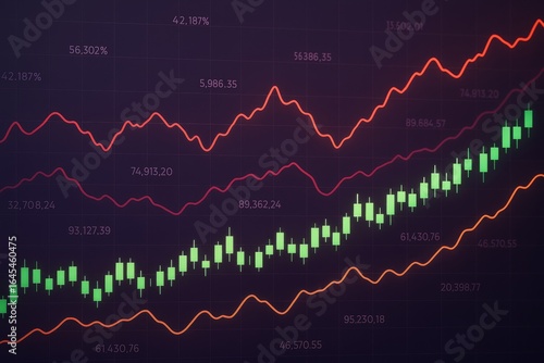 Abstract financial chart with glowing candlestick and line indicators on dark background showing rising market trends and data values.