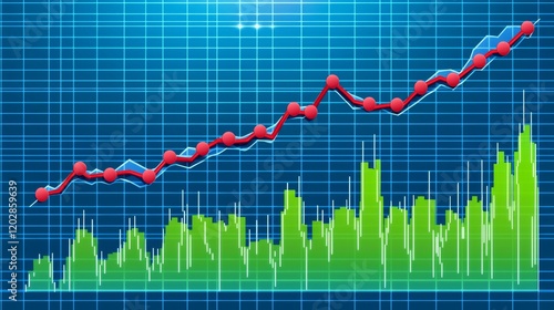 Abstract financial graph showing upward trends with red and green elements on a blue background representing market analysis data