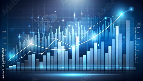 Abstract financial growth background with rising bar and line graphs, world map overlay, and upward arrows. Modern business data visualization in blue tones with golden highlights, symbolizing success