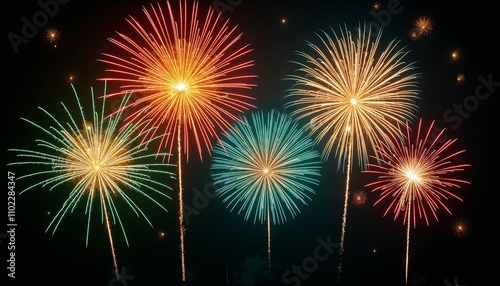 Abstract Fireworks in Saffron, Green, and White on Dark Background