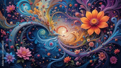 Abstract Floral Artwork with Vibrant Swirls and Colorful Lotus Flowers in a Dreamlike Setting