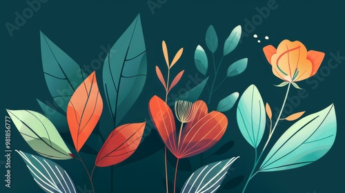 Abstract Floral Design with Red and Green Leaves on Dark Background