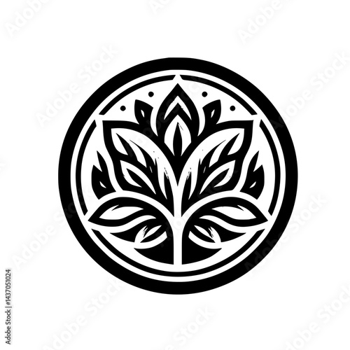 Abstract Floral Emblem in Circle, Black & White, Minimalist, Symbol