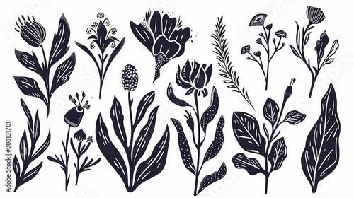 abstract flowers and leaves set . botanical linocut plant and organic elements. Ai generative