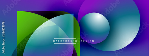 Abstract fluid shapes overlap, creating vibrant purple, green, blue gradients. Text reads background design centered below geometric forms. Modern aesthetic.
