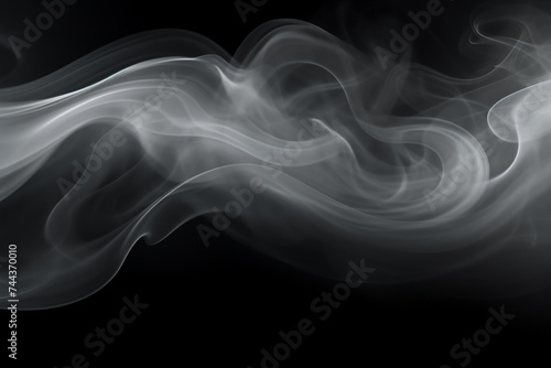 Abstract fog. White cloudiness, haze or smog moves on black background. Beautiful swirling gray smoke. Mockup of your logo. Wide angle horizontal wallpaper or web banner