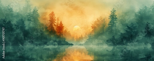 Abstract foggy forest with a hidden pond in watercolor.