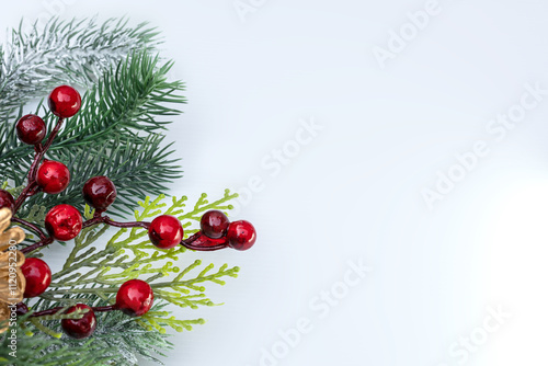 Abstract frosty Christmas decoration with snow pine branch and red berries, winter festive season background. Copy space.