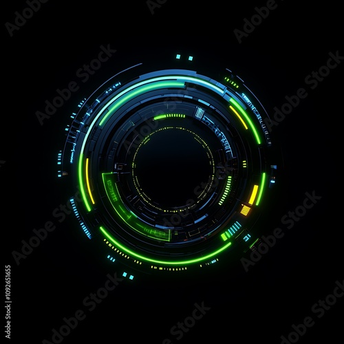 Abstract futuristic circular design with glowing lines and digital elements over a dark background, symbolizing technology and innovation in a modern interface