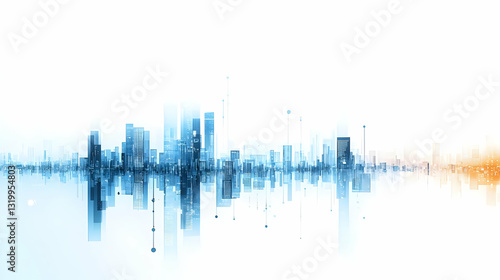 Abstract Futuristic Cityscape With Modern Buildings In Blue And Orange Gradient Reflected On White Background