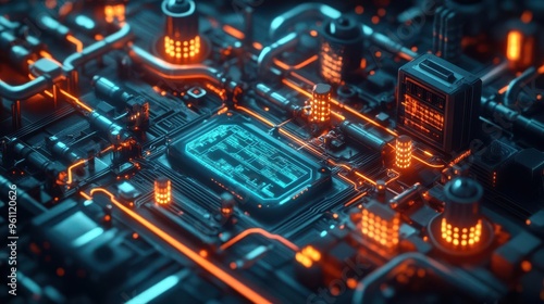 Abstract futuristic cyberpunk circuit board with glowing neon lights.