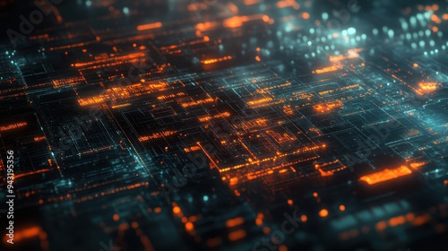 Abstract Futuristic Digital Circuit Board with Orange and Teal Glow - Technology Background.