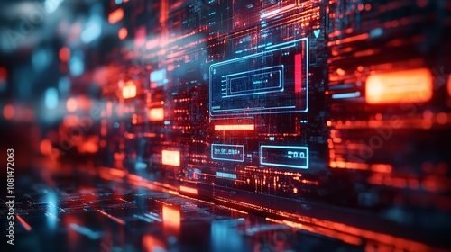 Abstract futuristic digital interface background with glowing red and blue data streams and symbols.