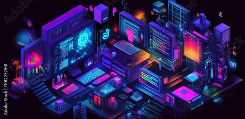 Abstract Futuristic Isometric Tech Cityscape with Neon Lights and Devices