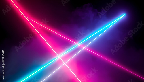 Abstract futuristic laser beams in vibrant neon colors, crossing against a dark smoky background, ideal for high-tech or cyberpunk designs.