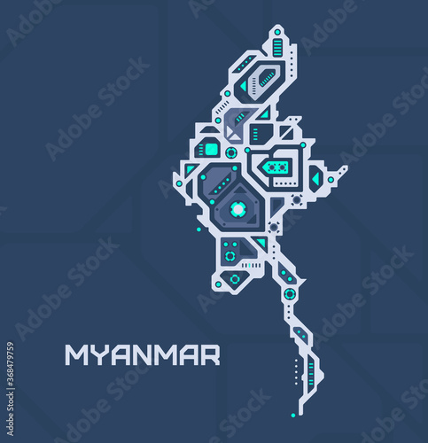 Abstract futuristic map of Myanmar. Mechanical circuit of the country. Technology space background.
