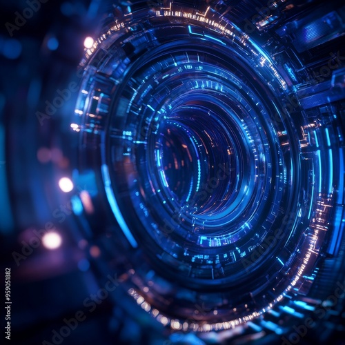 Abstract futuristic technology background with glowing blue and purple lights. Circular design with intricate details.