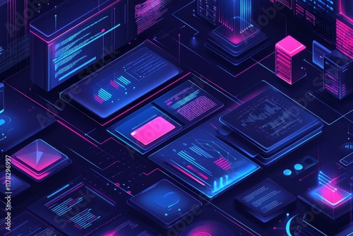 Abstract Futuristic Technology Background with Neon Interfaces and Data Streams