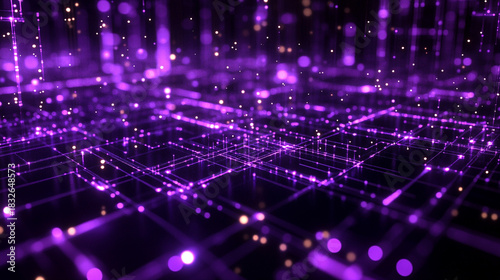 Abstract futuristic technology background with violet neon lines on a black surface, forming a glowing microcircuit grid with bokeh and shadow effects, ideal for tech and digital designs.
