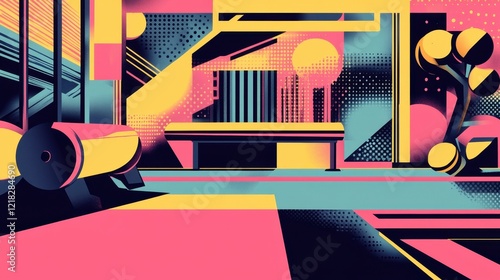 Abstract Geometric Artwork Featuring Bench and Shapes