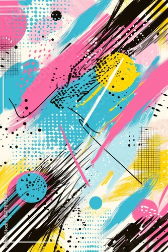 Abstract Geometric Background With Brush Strokes and Circles in Pink, Blue, Yellow, and Black