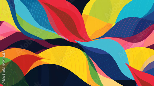 Abstract geometric background with leaf wave shapes in red, blue, yellow, green and purple