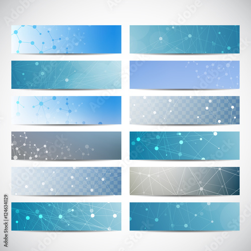 Abstract geometric banners molecule and communication. Science and technology design, structure DNA, chemistry, medical background, business and website