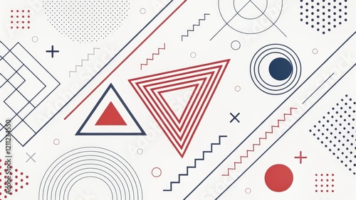 Abstract Geometric Design with Red and Blue Accents Featuring Triangles, Circles, and Lines