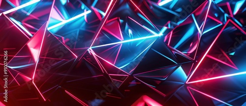 Abstract geometric light design with vibrant neon blue and red lights reflecting on triangular surfaces. Futuristic and dynamic visual.
