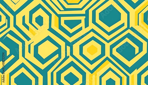 Abstract geometric pattern featuring hexagons in teal and yellow tones.