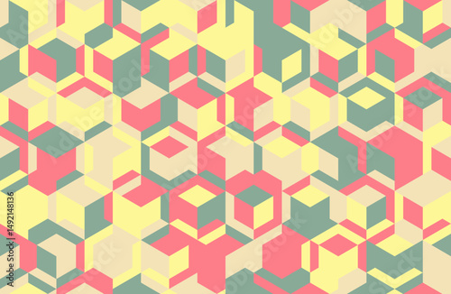 Abstract geometric pattern featuring pastel pink, yellow, and green cubes. Ideal for website backgrounds, textile designs, or modern branding projects.