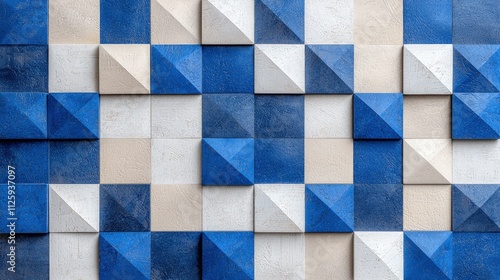 Abstract geometric pattern of blue and beige triangular textured tiles.