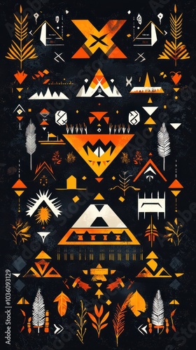 Abstract geometric pattern with vibrant orange and white symbols on a dark background offers a striking visual appeal