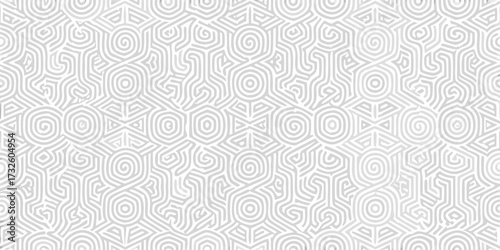 Abstract geometric seamless pattern with hexagonal and spiral elements in a light gray and white color scheme